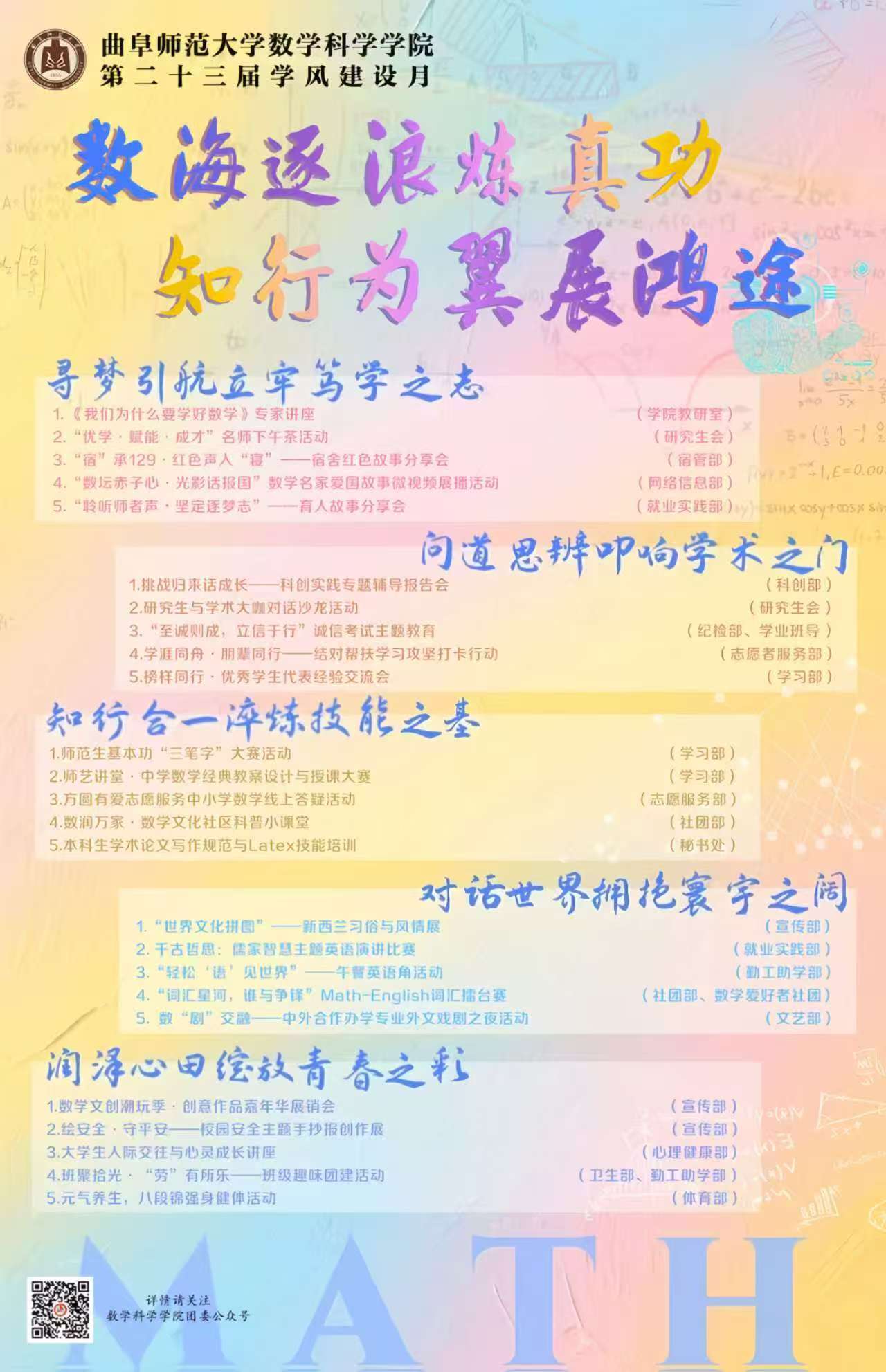 七十载学科发展成就,他指出,学风是孔孟之乡知行合一的现代延续,更是数学人治学底色的坚守。他强调,立足当前基础学科人才的迫切需求,优良学风是培养扎根教育一线、服务国家战略人才的根基。他寄语师生将严谨务实、追求卓越融入教学科研全过程,构建“全员抓、抓日常”长效机制,让优良学风成为注册送彩金
