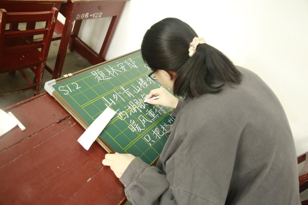 在比赛开始前,所有监督人员提前到场地外,尽力做好一切赛前准备,确保比赛顺利进行。开场前,每位参赛者们蓄势待发,眼神坚定,信心十足,在指定项目的门口站好,准备抽签进场。一分钟的准备时间过后,大家抓紧每分每秒的时间,钢笔字组的同学们以遒劲的笔锋书写着爱国诗篇,仿佛身临其境,保家卫国;粉笔组和毛笔组,将满腔的热情付诸于手中的粉笔和毛笔中,一腔爱国热情急待施展。