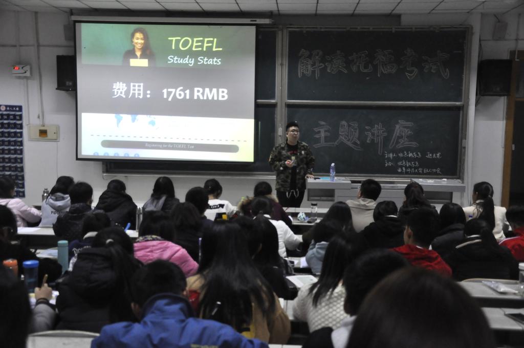 ELC协会特邀请北京新东方资深专家赵云龙为大家开设了此次讲座。讲座中,赵云龙老师依据他多年研究托福考试的经验,与大家分享了他对托福考试的理解,并就考试流程、注意事项、如何准备等为同学们进行了详细的解读。赵老师表示,在日常英语学习中,要注意学习的方法和技巧,注意素材的积累与应用,努力让自己的英语水平达到更高的高度。老师专业而又不失幽默感的语言更是让现场气氛十分活跃。现场同学,都认真听讲,并就重点内容做了摘抄笔记。全场掌声不断随着国际间交流的日益频繁以及就业竞争的日趋激烈,越来越多的人热衷于选择出国留学,而托福考试则是出国留学(美国、加拿大)的必备考试。为了让大家深入了解有关托福考试的问题,注册送彩金