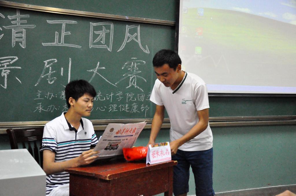 晚上七点比赛正式开始,选手们根据各自的抽签顺序,依次登场。在比赛过程中,选手们将自己的感情融入在角色之中,用表情,动作等将当代社会在为官,懒政,贪污腐败等方面所存在的丑恶现象表现得淋漓尽致,同时,各参赛队伍,还用心的将幽默的元素融入情景剧中,使主题性与趣味性兼备。整场比赛,台下观众反应更是十分热烈,大赛在掌声,笑声中圆满落幕,16级一班的作品荣获本次大赛的冠军。