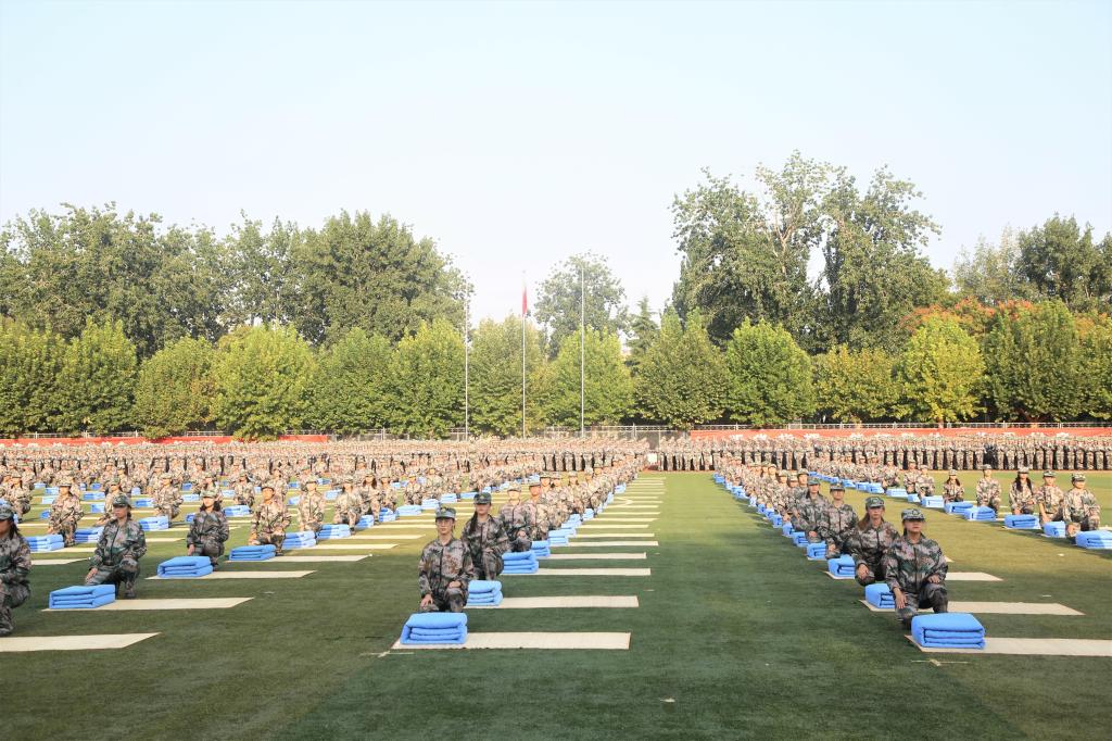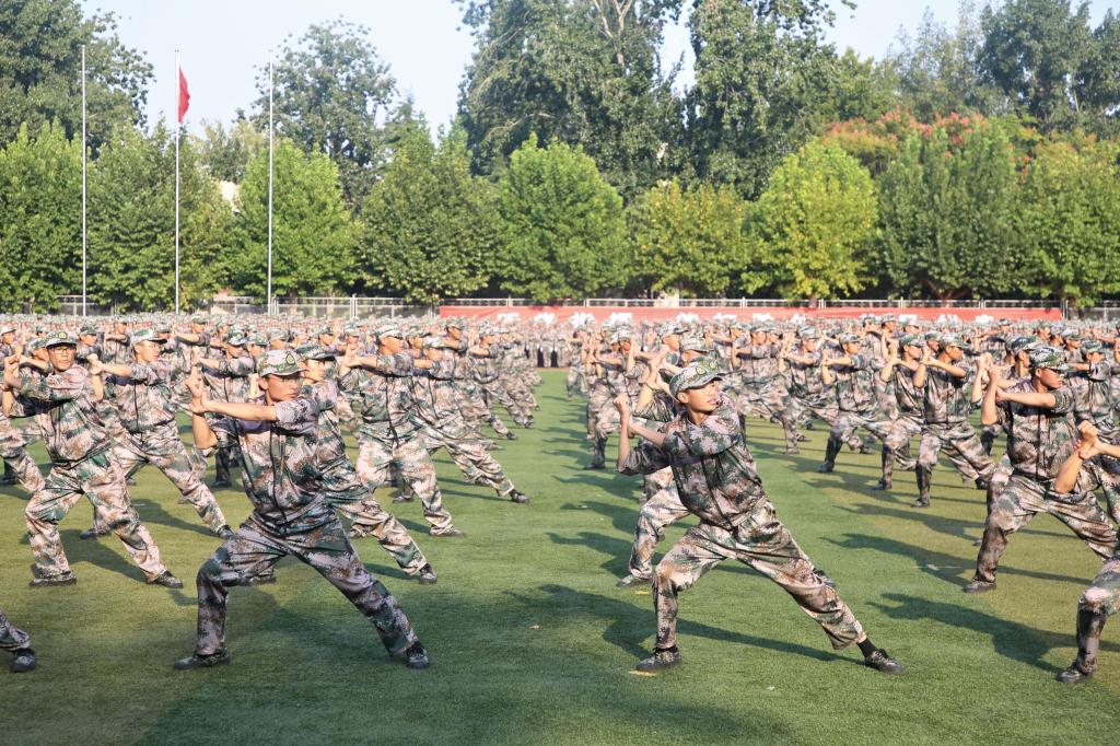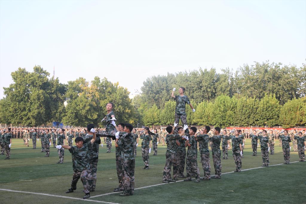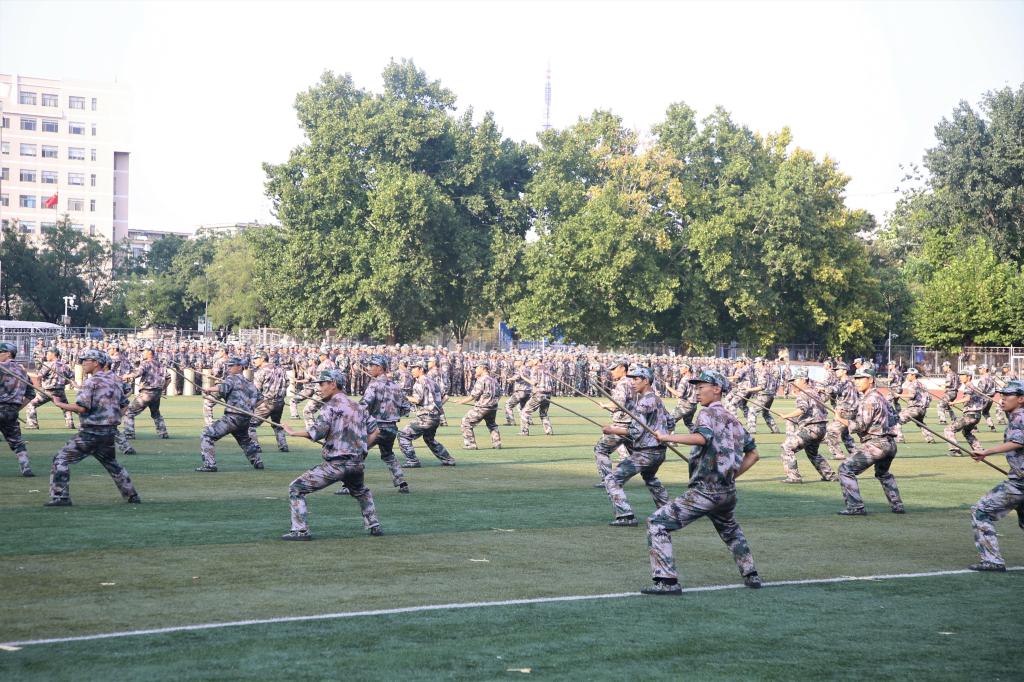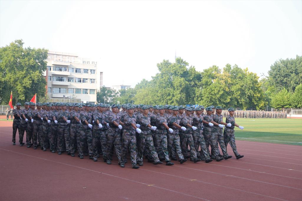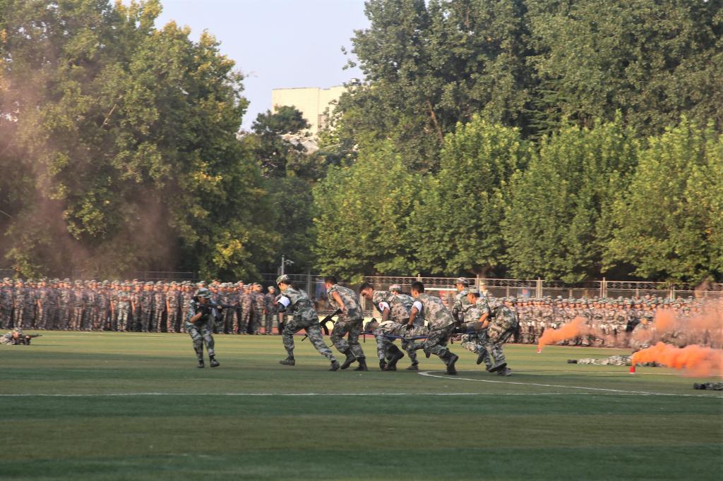 伴着雄壮的义勇军进行曲,五星红旗冉冉升起。一支支方队以崭新的面貌接受检阅,整齐的步伐是他们的成绩,响亮的口号是他们的誓言;黝黑的皮肤,坚定的眼神,无畏的气势代表着他们的成长。军体拳方队势如奔雷,擒敌拳方队锐不可当,心理健康操方队刚柔并济,内务方队干净利落,定向越野方队健步如飞,剑术方队表演震撼让人热血沸腾。标兵连配合方队的变换,摆出“70”、“听党指挥忠于党”、“学而不厌诲人不倦”等字样,军训教官带来的倒功格斗和战地救护表演更是赢得现场阵阵欢呼,他们摔打摸爬,铁骨铮铮,尽显真功夫。