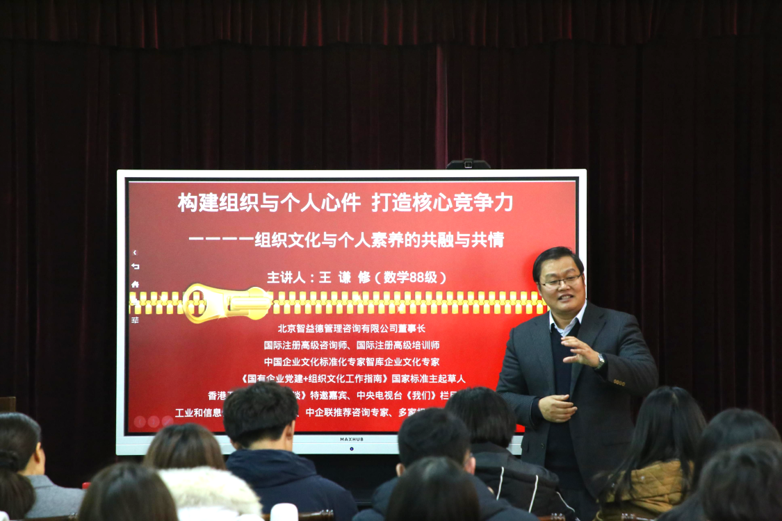 邀请88级校友、北京智益德管理咨询有限公司董事长王谦修作了题目为“构建组织与个人心件 打造核心竞争力——组织文化与个人素养的共融与共情”的报告。报告会由注册送彩金
