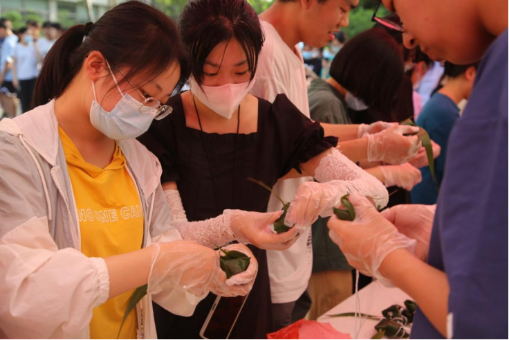 特意请到了包粽子手艺娴熟的赵老师为同学们展示这门手艺。看着赵老师灵活的手在粽叶间翻飞,同学们不由得赞叹,也更加跃跃欲试。活动现场的师生们先后开展了书写寄语、诗朗诵、包粽子、旱地龙舟等活动,度过了一个充满乐趣和教育意义的端午节。