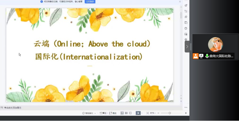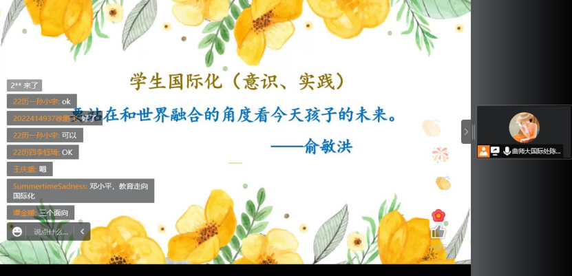 曲阜师范大学国际交流合作处陈晓丽老师以同学们留学意向为切入点,从多方面分析了出国留学的发展前景和方向,并通过分析国内外形势、我国高等教育国际化发展趋势和学校国际交流发展现状,介绍了学校出国留学平台和留学服务政策,并鼓励新生做好人生规划,开阔国际视野、培养国际意识、提高外语应用能力,为未来发展提供更广阔的空间。