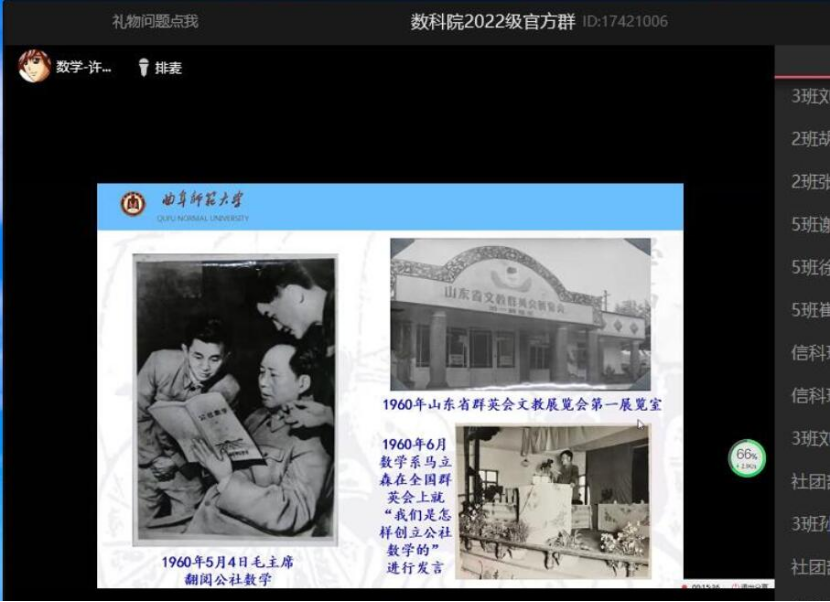 2022级新生回望了六十六载曲园数学记忆。他从筚路蓝缕的办学历程、引以为傲的公社数学、兼容并包的学术交流、不忘初心的发展壮大四个方面介绍了学校数学学科的发展历程。从1956年的“建立次年曲阜安,北上南下忙招贤”到1972年的“复旦赠送 一零三,如获至宝日夜伴”,再到如今的数学与应用数学专业首批入选国家级一流本科专业建设点和信息与计算机科学专业入选山东省一流本科专业建设点,许勇军通过对注册送彩金