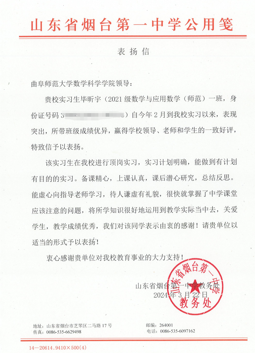 学生毕昕宇于烟台第一中学进行实习,得到了实习学校的肯定。为此,其特向我校发送表扬信,对于毕昕宇个人的优秀表现和我校的优良学风予以高度赞扬,对两位同学的工作表现和我校的有力支持表达诚挚感谢。